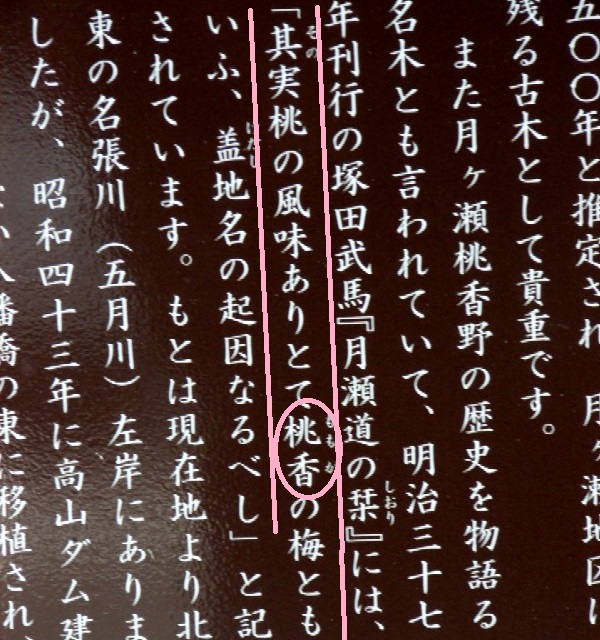 「桃香の梅」と呼ばれたことが地名の由来であると書いてあります。